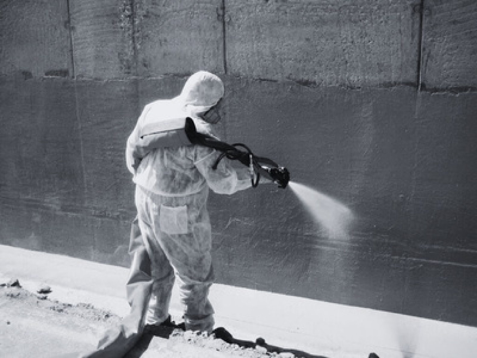 Spray-applied polyurea coating applied to retaining walls providing robust, chemical-resistant, and flexible protection across all vertical surfaces and complex details
